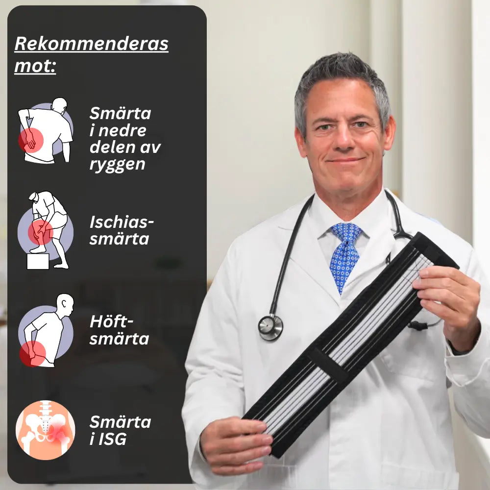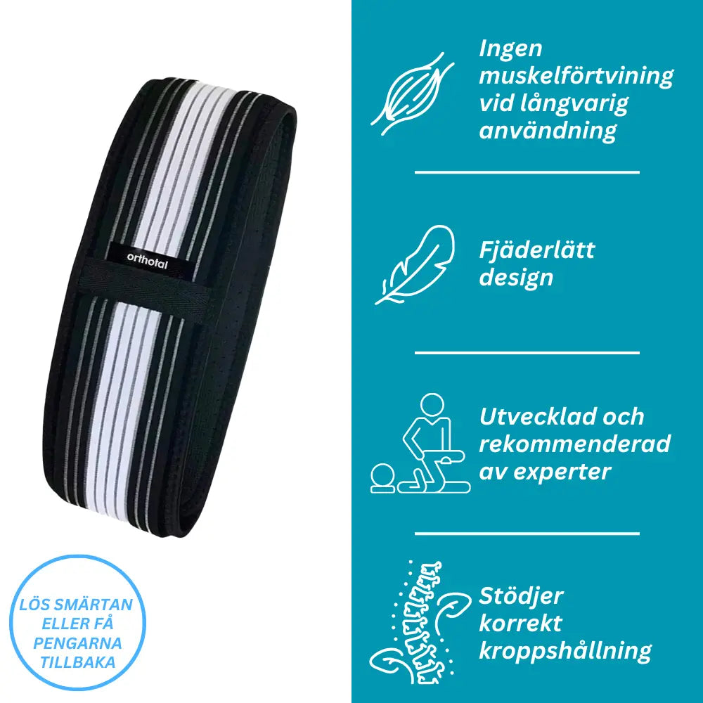 Ortobältet stabiliserar specifikt området L5 i ryggraden genom målinriktad kompression, riktar in bäckenet korrekt och återför ISG-leden till sitt naturliga rörelseområde.